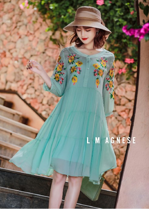绿色,也是夏日的代表色系。这一款纱裙在原有的大裙摆基础上采用了独特的收腰、垫肩设计,让服装整体呈现的修身效果更佳,不仅显瘦而且更显高挑。撞色碎花设计也让衣服从整体视觉上呈现得更加饱满有趣。清风暖阳间,不自觉地将春色也带入了夏季,在街头巷尾处留下你清冽的身影。